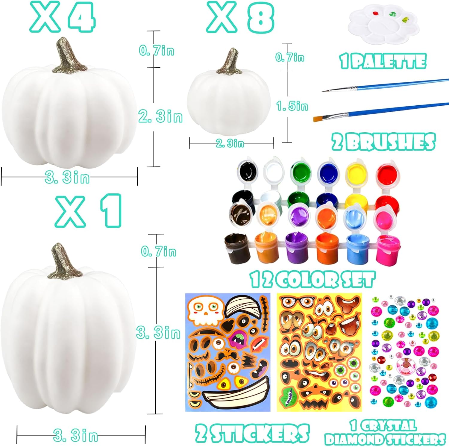 【3 Size & 12 Color】- The unpainted pumpkins come in 3 sizes. 1 large paintable pumpkins: 3.3” tall, 3.3″ wide; 4 medium pumpkins: 2.3” tall, 3.3″ wide, 8 mini pumpkins: 1.5″ tall, 2.3″ wide. The paints come in 12 different colors, 2ml of each color, which is enough to make a beautiful Halloween pumpkin.