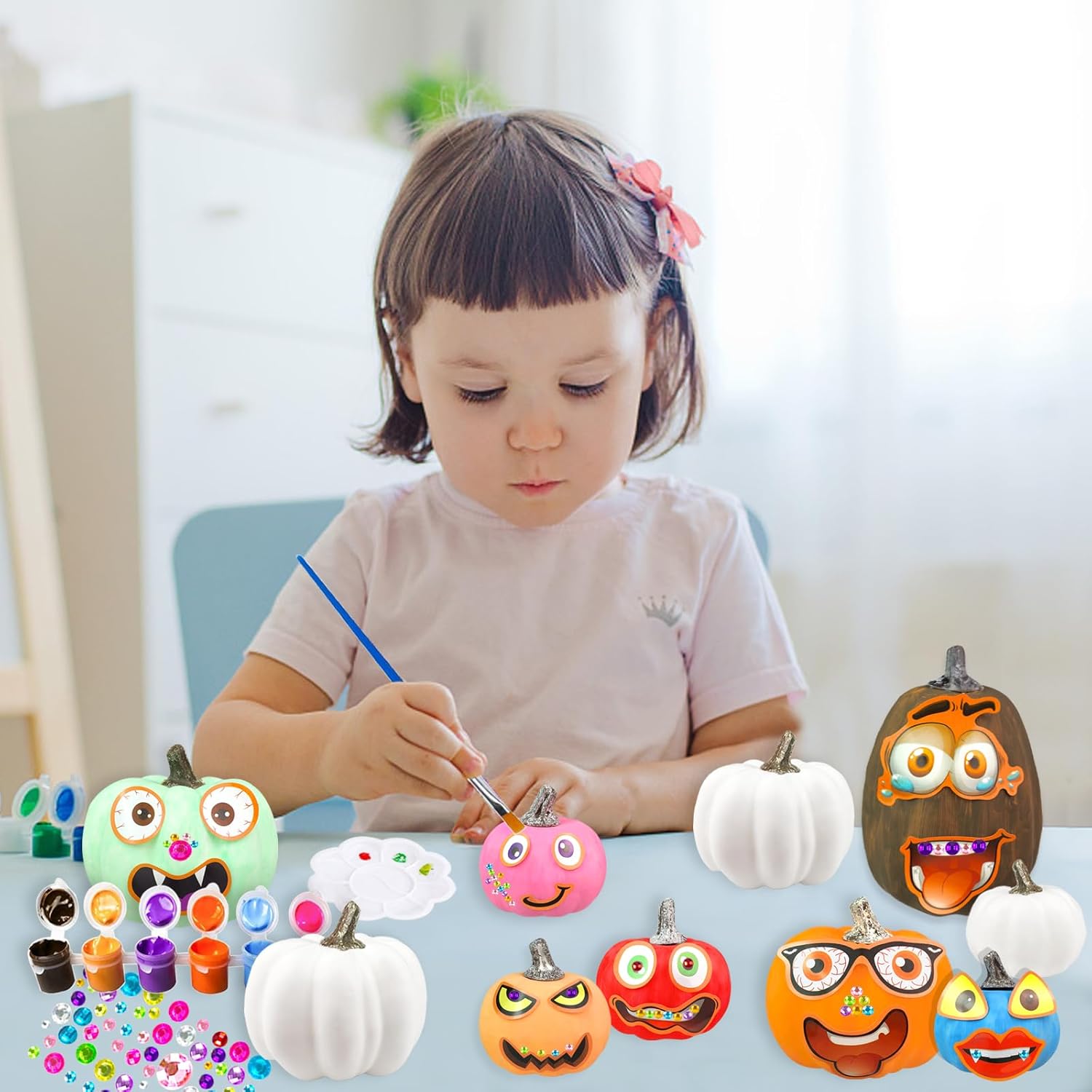 【Halloween Crafts Kit】- JIABNUKKN DIY Pumpkin Paint Craft Kit includes 13 Halloween white plastic pumpkins, 12 Color Paints, 2 Brushes, 1 Palette, 1 sheet of stickers and 2 sheets of face halloween stickers for kids. Everything you need to create a unique Halloween pumpkin is contained in this kit. Great Halloween arts and crafts for kids ages 4 5 6 7 8 9 10 11 12.