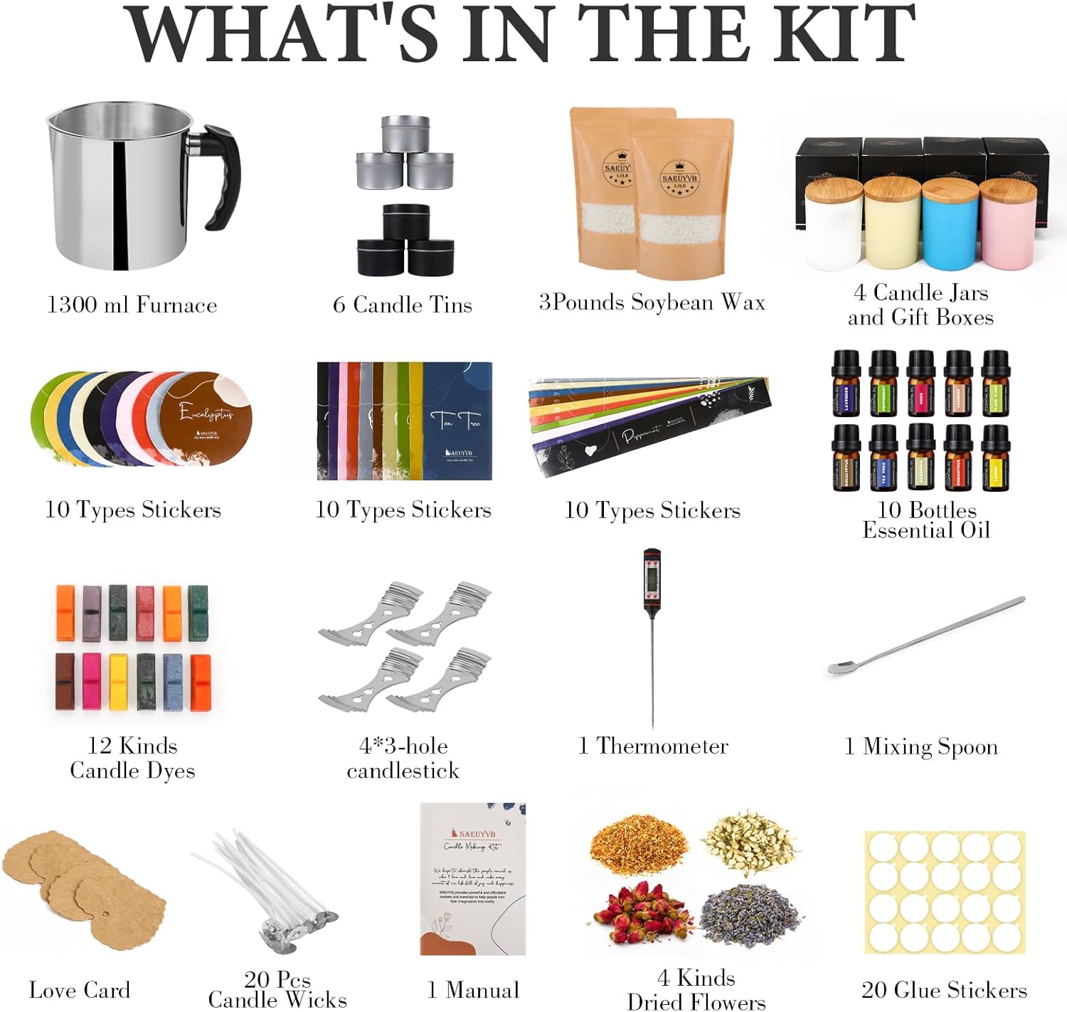 🎁【A Complete Candle Making Kit】The natural soy wax candle making kit comes in a beautiful giftable box, includes 1.5 Pounds Soy Wax x 2, 1.3L candle melting pot, Candle Tin x 6, Candle Jars x 4, Candle essential scents x10 , Wax Dyes x12 , Dried flowers x 4, Wick holder x 4, thermometer, beautiful candle labels, wicks, stirring spoon, and much, much more ! A detailed making instruction manual let you easily enjoy the joy of making aromatherapy candles.