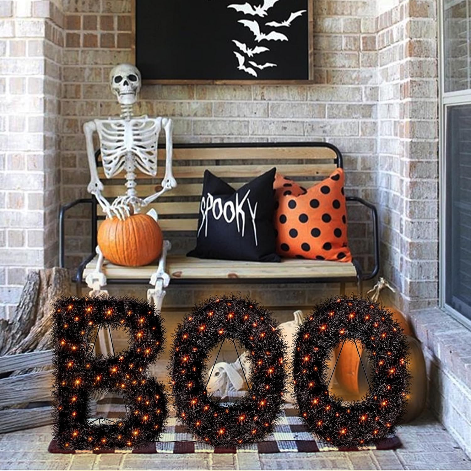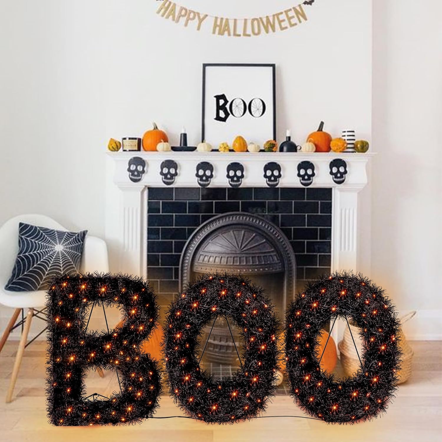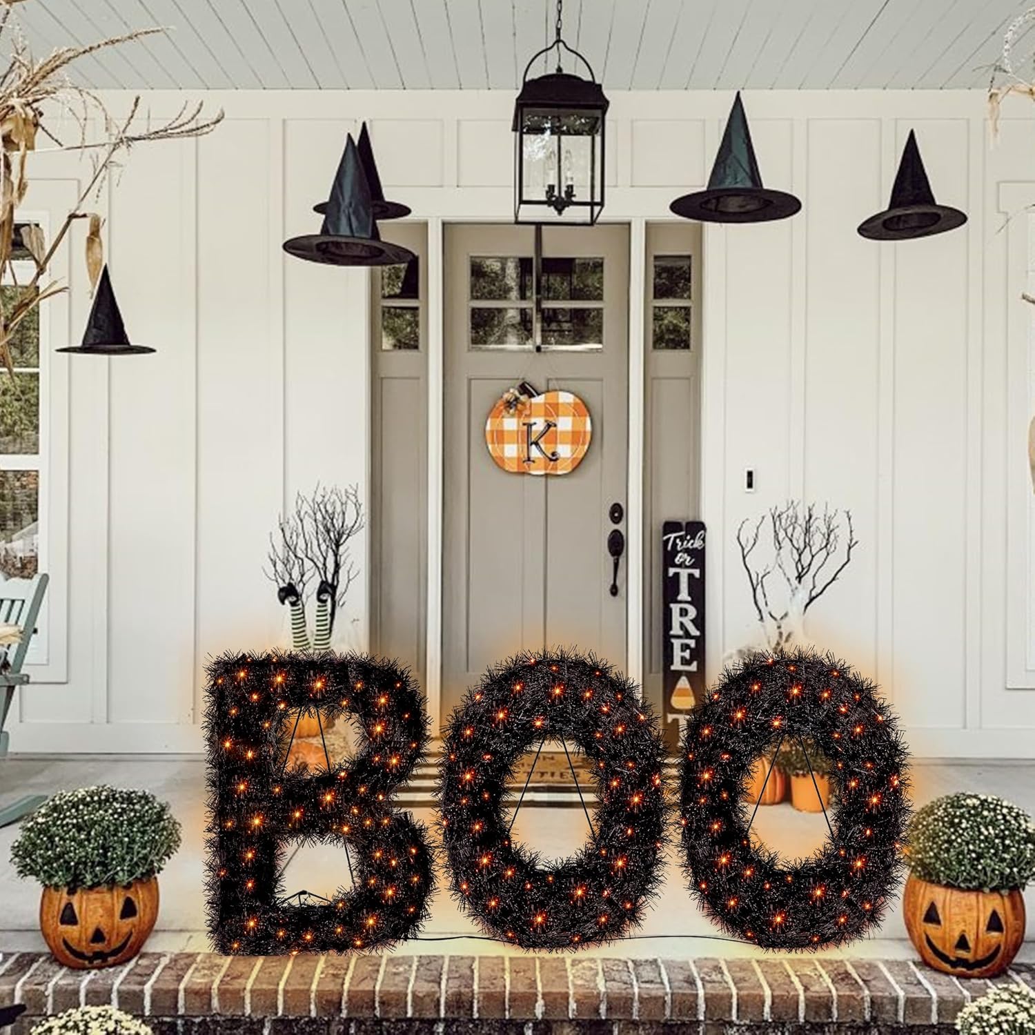 🕸️【 HALLOWEEN PARTY DECORATIONS】This pre-lit boo sign is sure to be an attractive addition for Halloween indoor and outdoor decoration! Use this Halloween sign as a party decoration or a door decoration to invite your friends to join the crazy Halloween party! This wreath door ornament is perfect for Halloween door decorations, Halloween party favors, spooky party favors, Halloween photo props and more!