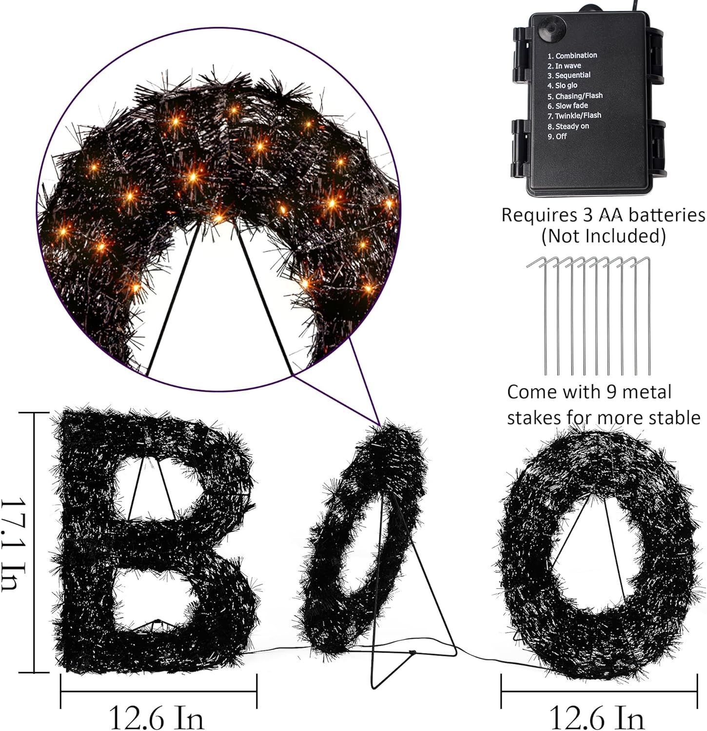🕸️【PRE-LIT 89 LED LIGHTS】This set of 3 Halloween BOO letters yard light is pre-strung with 89 battery operated purple LED lights (Need 3 AA batteries, not included), has 8 different modes to satisfy your needs, bring purple glow to light up your house. With 6-hour automatic timer, it will turn off after 6 hours of lighting and light up again after 18 hours.
