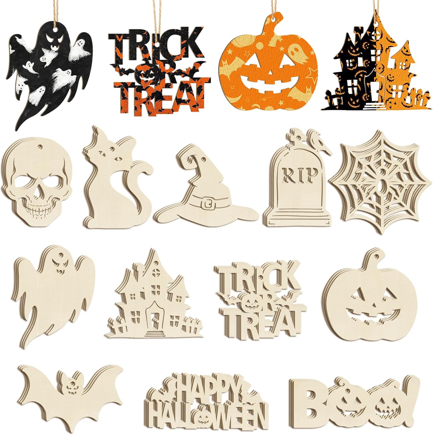 Halloween Ornaments Includes: 12 blank Halloween wooden circles of different shapes(Skull Pumpkin Ghost Bat BOO Trick or Treat Halloween Cutouts)for DIY painting, each fall cutout contains 3 pieces. Comes with 36 braided linen cords