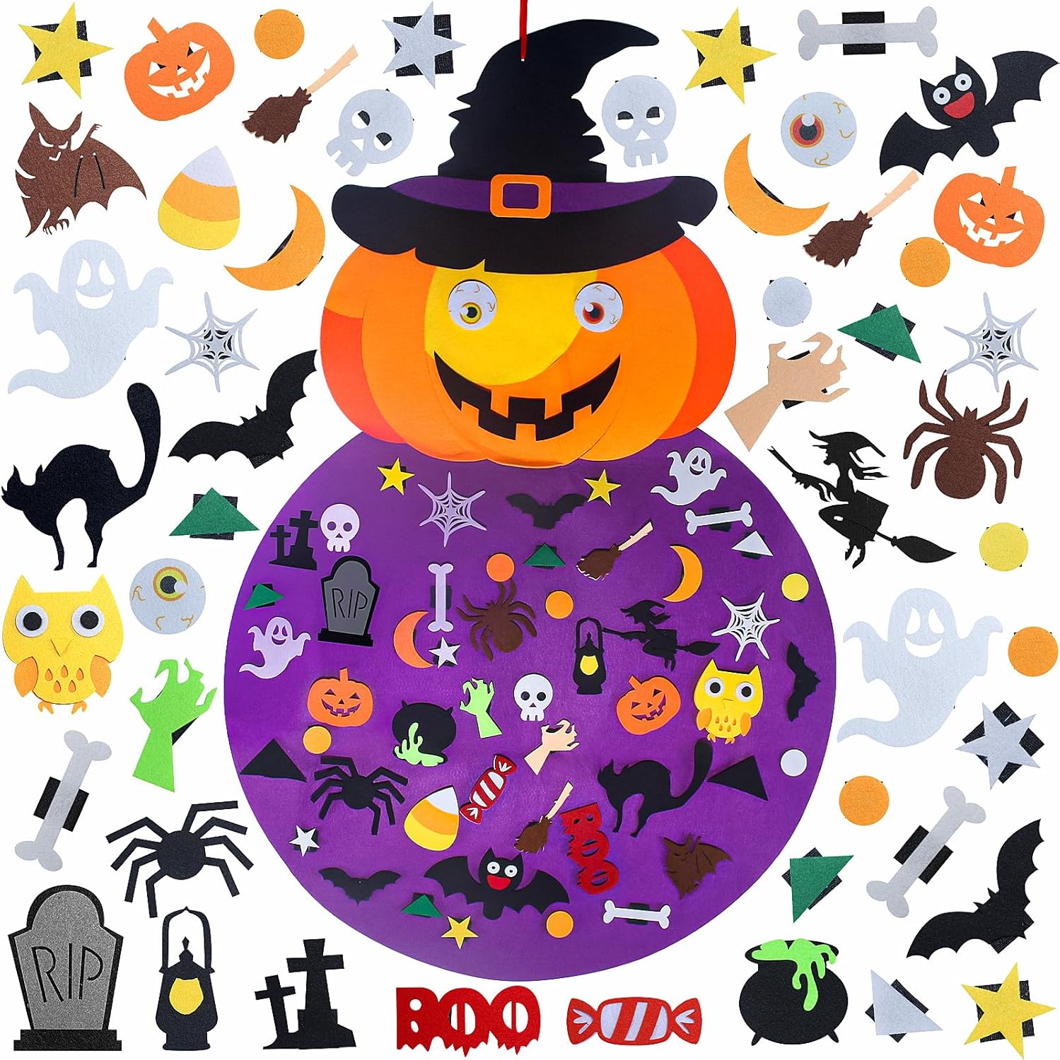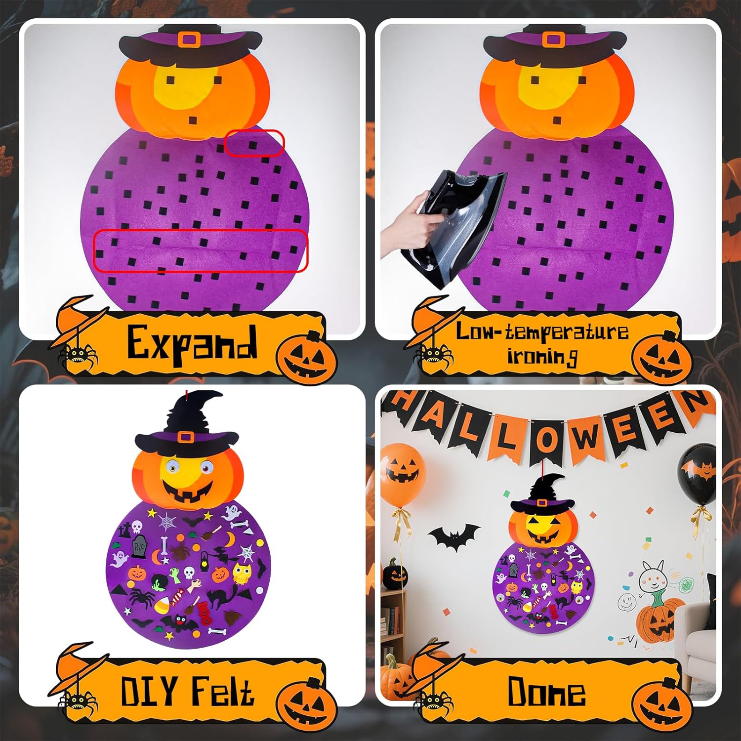 🎃【Colorful decorations】: There are more than 50 different ornaments for you to choose from and decorate to make your own felt pumpkin. The felt witch has an oversized pumpkin belly, which allows children to explore more possibilities and fun. It can be decorated anywhere to bring a Halloween atmosphere. Ideal for Halloween outdoor/interior decoration. Ideal holiday decoration for home decoration, wall decoration, door hanging decoration, room decoration, shopping mall decoration, window decoration, etc.