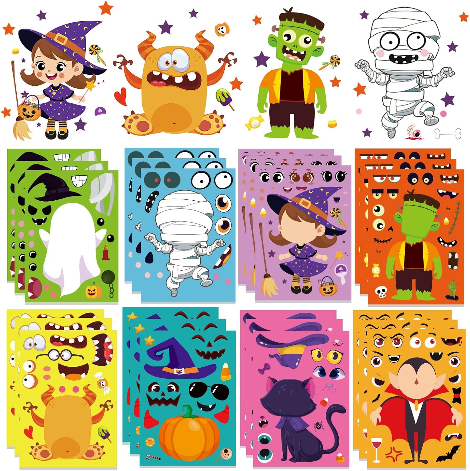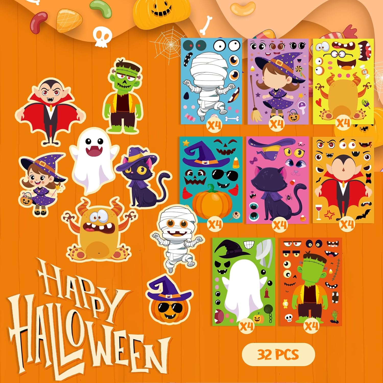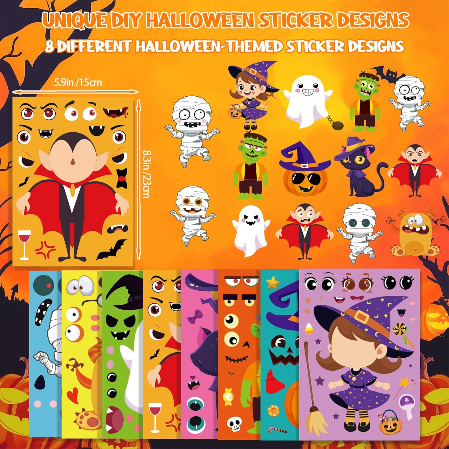 GREAT VALUE HALLOWEEN PARTY FAVORS SET: Contains 32 fun Halloween expression stickers with 8 classic Halloween characters – witch, ghost, pumpkin, mummy, zombie, vampire and more! These Halloween stickers are perfect for Halloween party favors, classroom rewards, and Halloween trick-or-treating bag fillers. These Halloween crafts are rich in variety and quantity, perfect for group games, sharing with friends, and creative play.