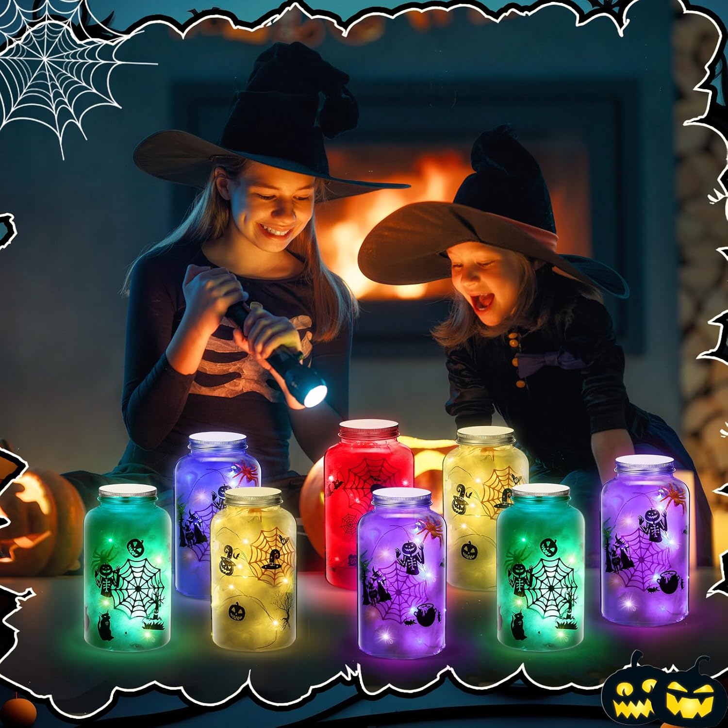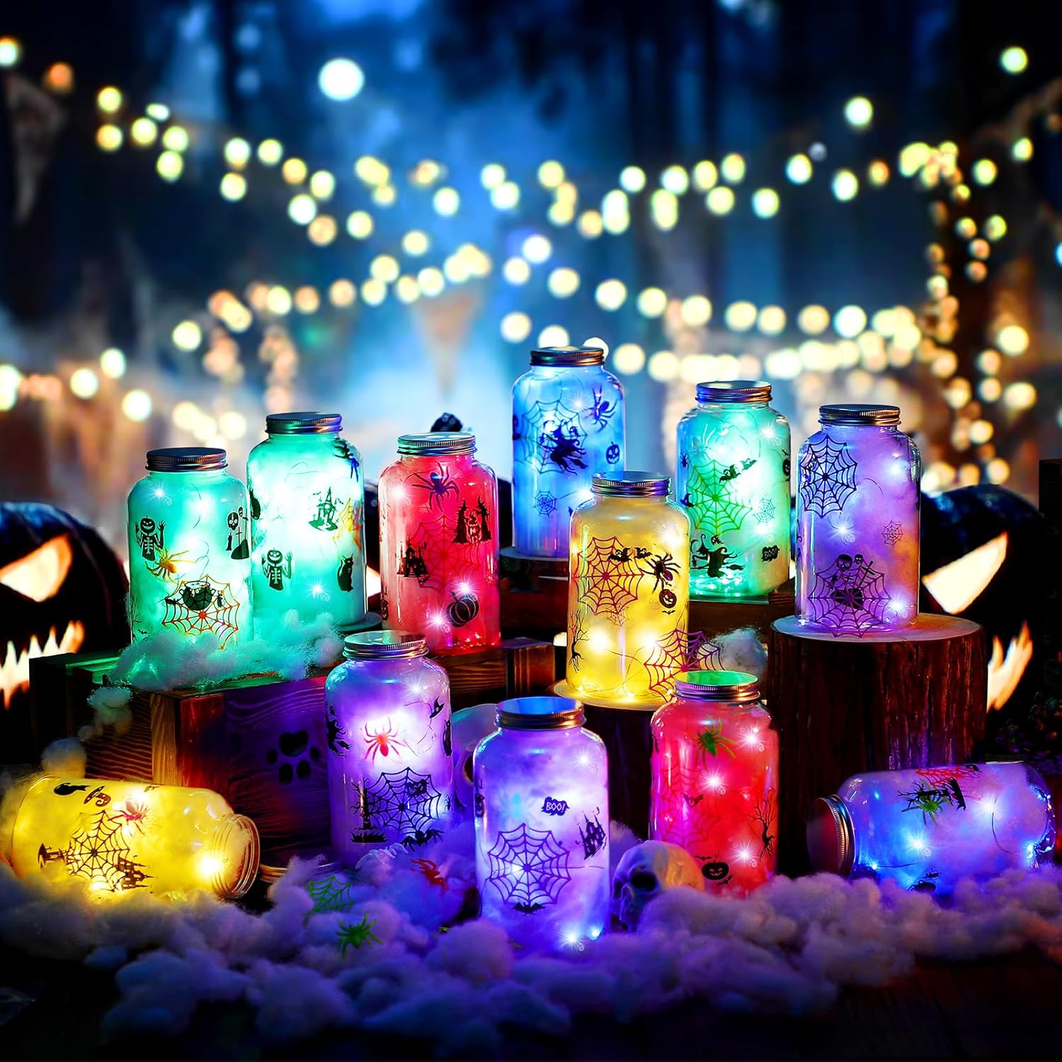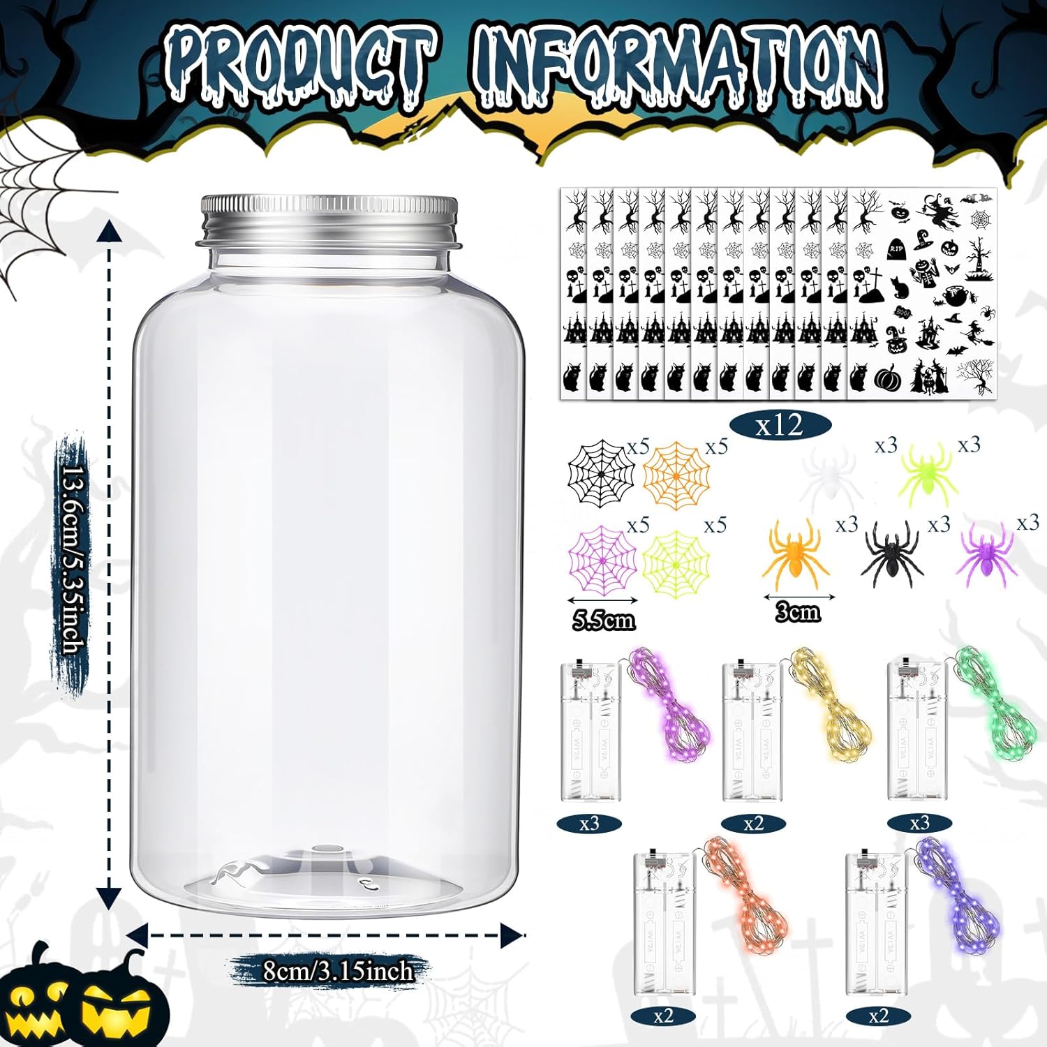 Halloween DIY Clear Jar Kit: the package includes 12 Halloween DIY clear jar, 12 light strings (batteries are not included, you need to prepare 2 AA batteries by yourself) and 12 stickers, 18 spider ornaments, 20 spider webs; Enough quantity for you to give full play to your imagination and DIY your own Halloween crafts
