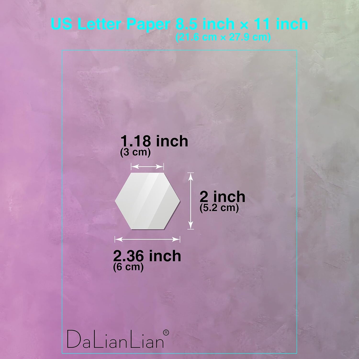 Dimension & Pack – Regular Hexagon Mirror. Length 2.36 inch. Width 2 inch. Thickness is about 1/25.4 inch. Thickness is about 1/25.4 inch. Each pack include 12 pieces hexagon wall stickers.
