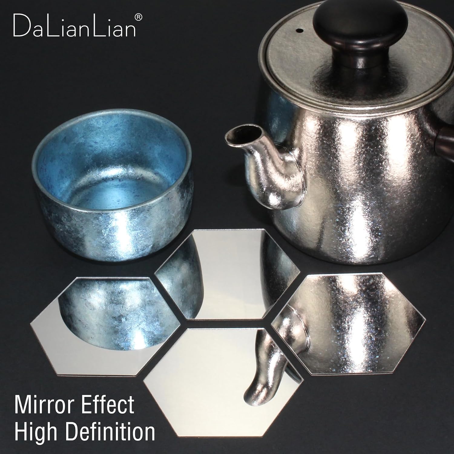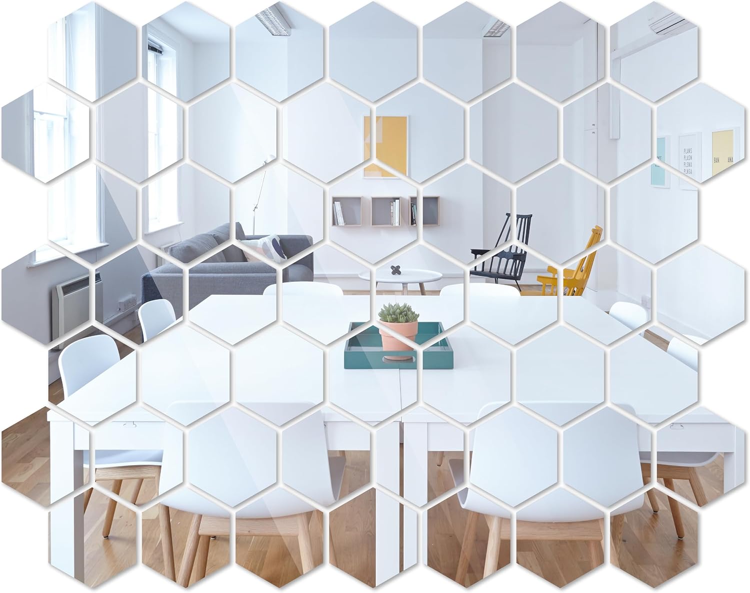 Hexagon Mirrors for Wall – Regular hexagon shape wall stickers / mirror tiles. Made of acrylic with high reflective mirror effect. Back side of the mirror tiles has self-adhesive. Easy for you to make decoration at home. Mirror side has protective film to prevent scratch. Gold or silver color for choose.
