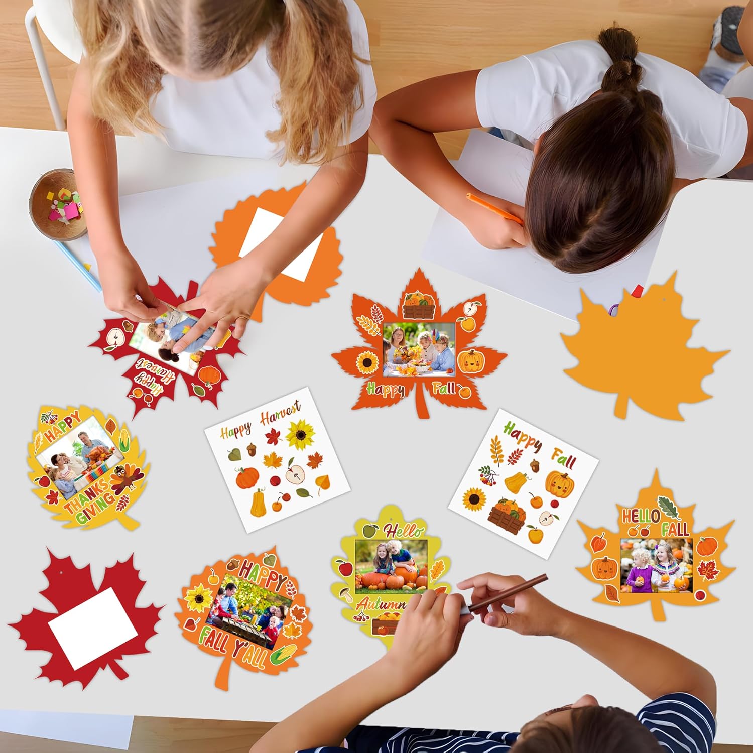 Funny DIY Process: this fall DIY photo frame craft kit is a fun creative project for kids; they can decorate the frame with stickers to develop creativity and color recognition; each set includes 2 leaf-shaped cardstock to assemble one picture frame with photo display space; the back features writing space for names and dates, creating a memorable seasonal keepsake.