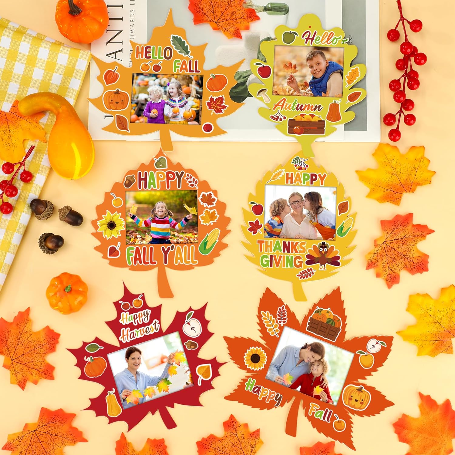 Suitable Size: measuring 5.11 x 6.69 inches, each fall leaf photo frame features a 3.2 x 2.4-inch picture display area; the pre-punched cardstock comes with attached hanging strings, while the back offers ample space for personal messages, names, and dates.
