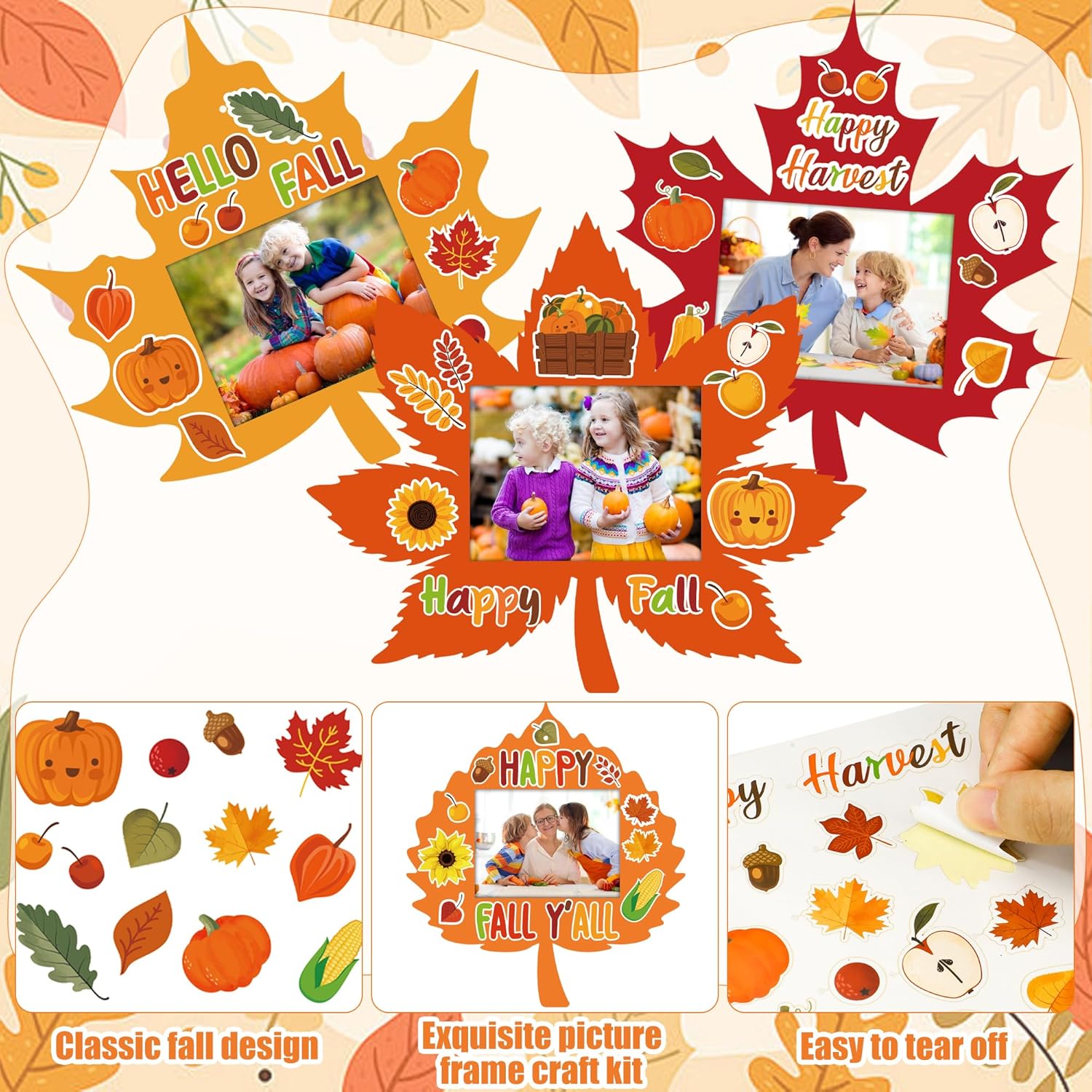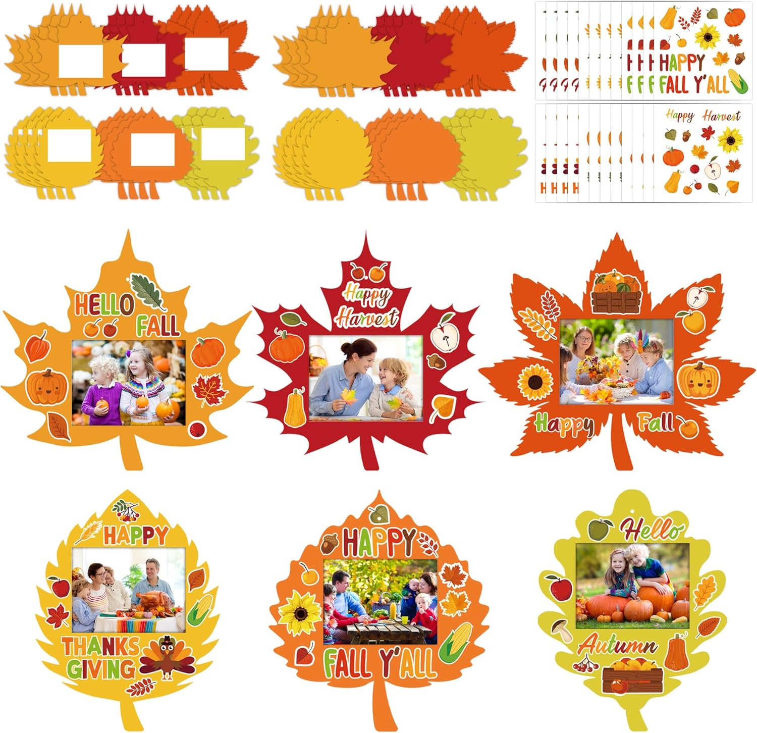 Premium Material: these fall maple leaf DIY photo frames are crafted from sturdy cardstock; the included stickers feature vibrant autumn-themed designs, such as pumpkins, maple leaves, turkeys, and corn, along with phrases like ‘Welcome Fall’ and ‘Hello Autumn’; ideal for harvest-themed parties and seasonal decorations.
