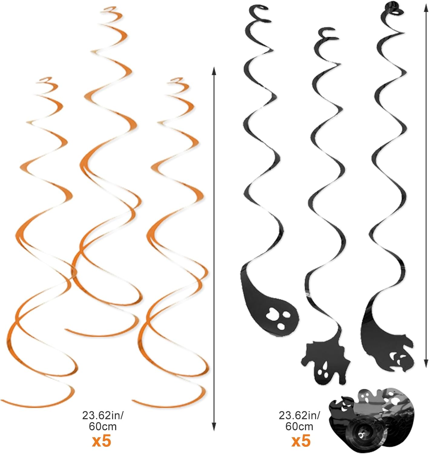 Complete 14PCS Halloween Décor Set – Includes 1 pre-strung “HAPPY HALLOWEEN” banner, 3 paper garlands (pumpkin, ghost, bat), and 10 hanging swirl decorations, perfect for creating a spooky party atmosphere.