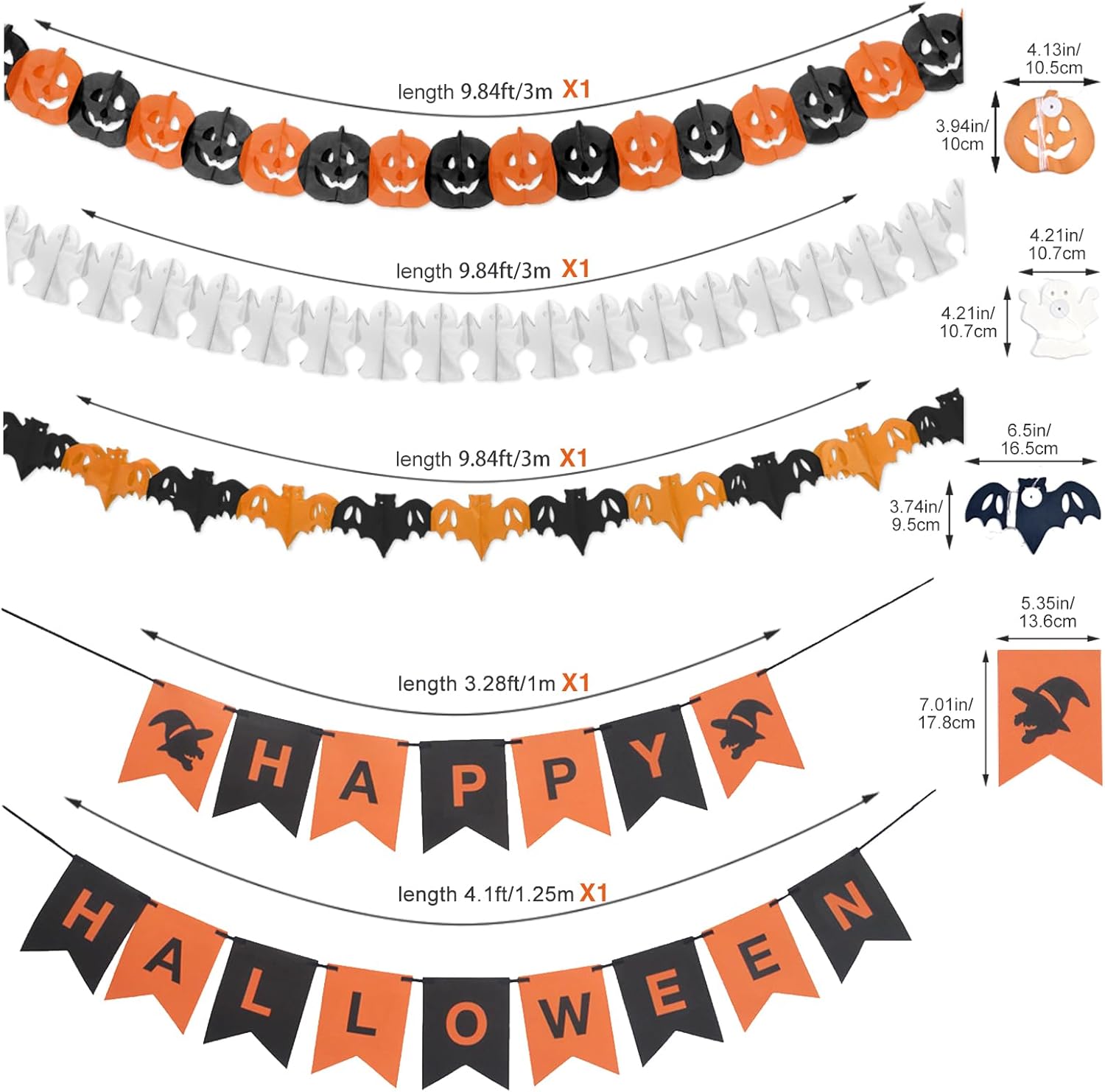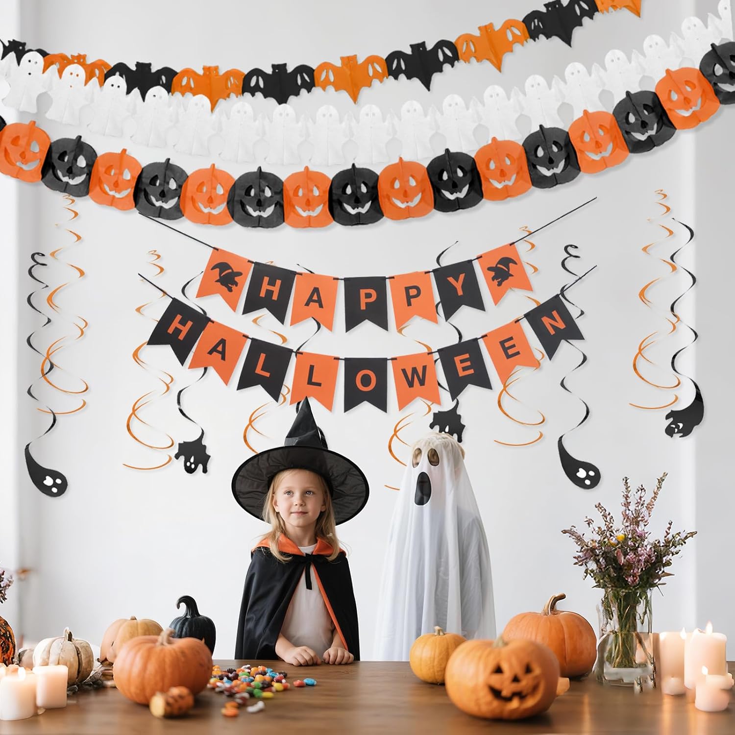 Halloween Party Decorations Set-14pcs Including Pre-Strung Happy Halloween Paper Banner for Home Decor, Ghost Hanging Swirl and Bats Pumpkin Garland NO DIY