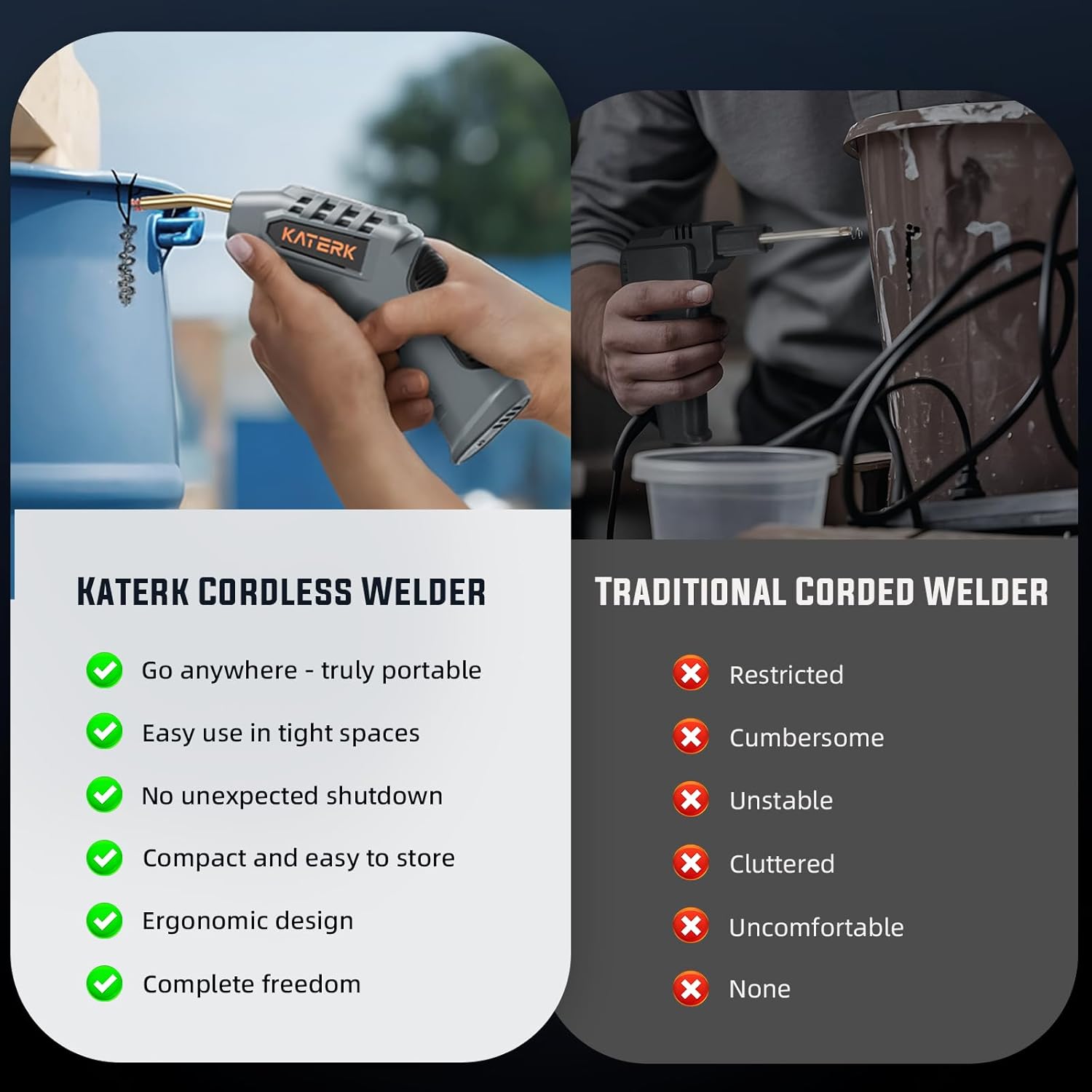 Cordless Freedom, Welding Anywhere: The Katerk cordless plastic welder eliminates tangled cords with a compact design, easily accessing tight spaces like vehicle chassis. No outlet needed—weld indoors or outdoors instantly. Its portable design removes the limitations of traditional wired guns and workspace constraints.