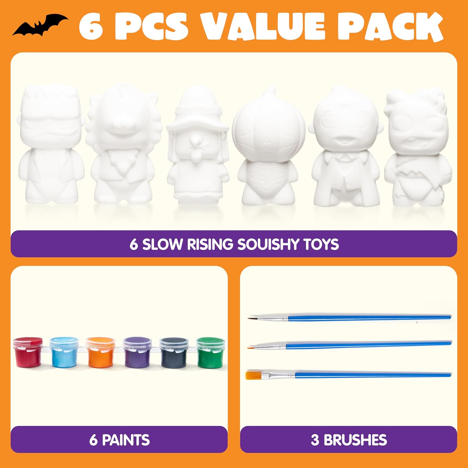 SUPER VALUE PACK. Our coloring Halloween squishy toys come in 6 squishy toys in 6 colors paints, and 3 paintbrushes. Decorate & color your own Halloween squishy toys.