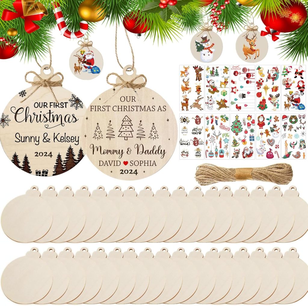 100Pcs DIY Wooden Christmas Ornaments, 2.4 Inch Wood Slices with 10 Stickers, Unfinished Predrilled Wood Circles for Crafts, Round Wooden Discs Holiday Hanging Decorations